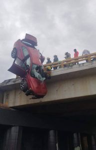 Falleció una mujer durante accidente de auto donde viajaba la familia, quedando colgado en el puente de vías del tren...