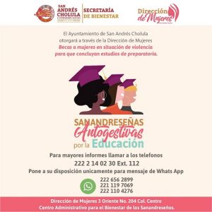 Vecina sanandreseña, la Dirección de Mujeres San Andrés Cholula trae la beca “Sanandreseñas Autogestivas por la Educación” para que mujeres...