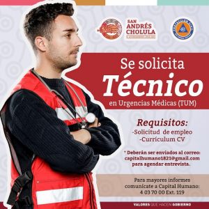 La Dirección de Protección Civil San Andrés Cholula solicita Técnico en Urgencias Médicas (TUM). Para mayores informes, comunicarse con la Dirección de...