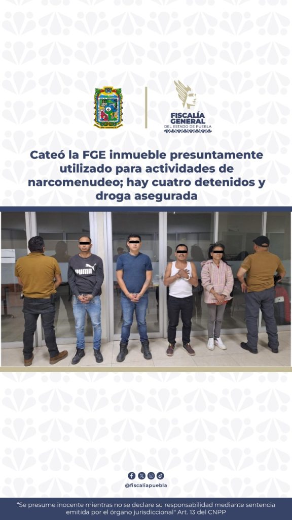 La Fiscalía General del Estado de Puebla realizó acciones para combatir el narcomenudeo en el municipio de Puebla, logrando la detención de Verónica N., Adrián N., Erick N., y Óscar N., como probables responsables de delitos contra la salud en su modalidad de posesión con fines de suministro de los narcóticos denominados metanfetamina y marihuana.