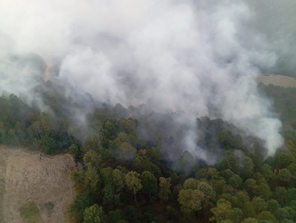 - En la zona del municipio ubicado al sur del estado, se mantiene un helicóptero en el combate del fuego, junto a brigadas de Protección Civil, CONAFOR, Policía Forestal y la Brigada Coyote 7.