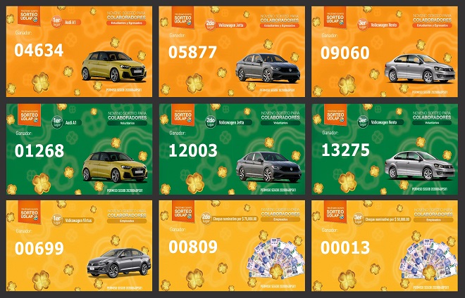 El esquema de los premios para colaboradores fue en la modalidad de estudiantes y egresados repartió un Audi A1 Sportback, un Jetta 2020, un Vento 2020, cinco Macbook Air 128 GB, diez cheques nominativos de 5 mil pesos, veintidós cheques nominativos de 4 mil pesos y diez AirPods Apple. En la categoría de colaboradores voluntarios se dieron un Audi A1 Sportback, un Jetta 2020, un Vento 2020; 10 pantalla 60″ Smart TV, 19 tableta Apple Ipad 10.2″ 32 GB, y 18 cheques nominativos de 5 mil pesos. Finalmente, en la categoría de empleados se entregaron un Virtus 2020, un cheque por 75 mil pesos, un cheque por 50 mil pesos, dos cheques nominativos de 20 mil pesos, 10 pantallas 50″ Smart TV y 15 cheques nominativos de 5 mil pesos.