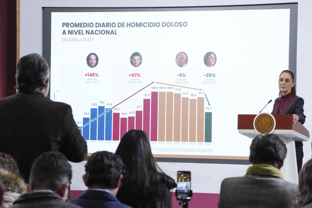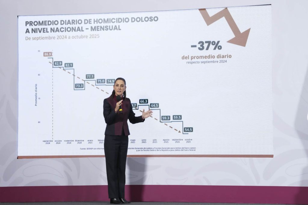 “Durante el periodo del presidente López Obrador, nueve por ciento de reducción de homicidios dolosos, y con nosotros, contabilizado por año, 28 por ciento. Contabilizado de septiembre de 24 a octubre de 2025, 37 por ciento de reducción.