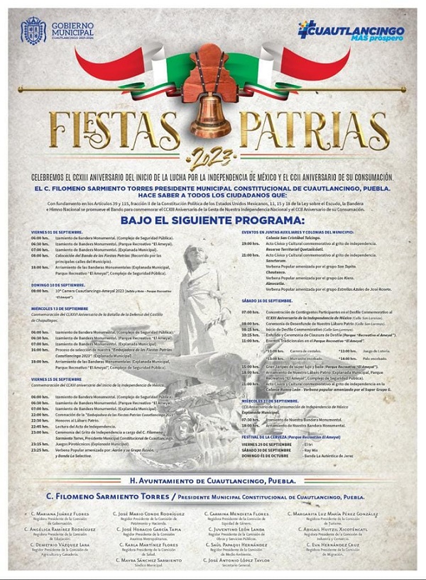Con la pega del bando de Fiestas Patrias, el presidente Municipal Filomeno Sarmiento, acompañado por la presidenta del DIF Municipal Licenciada Mayra Ramírez Escamilla, dieron inicio a las celebraciones al 203 Aniversario de la Independencia de México, destacando entre estos festejos la Carrera de 10 kms. Cuautlancingo 2023, así como el Festival de la Cerveza, con la presentación de “El Tri” Y Raymix, el cual tendrá un costo de acceso de $100, además el día 15 conmemorativo a la Noche del Grito la presentación de Aarón y su grupo Ilusión, eventos donde se pondrá la mayor vigilancia en el lugar de estos eventos y desde luego la seguridad vial el día de la carrera.