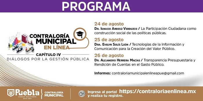 El Ayuntamiento de Puebla invita a todas y todos los interesados a participar en el capítulo IV de la Contraloría Municipal en Línea, Diálogos por la gestión pública, el último capítulo de esta serie de seminarios virtuales contará con expertos en las materias de gestión pública, gobierno abierto y transparencia presupuestaria.