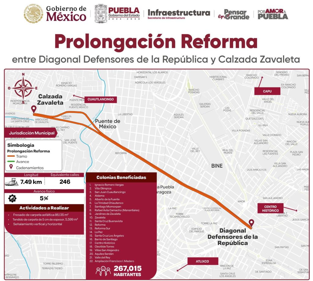 El secretario de Infraestructura, José Manuel Contreras de los Santos, informó que se trata de una rehabilitación integral de la avenida, la cual favorecerá a los habitantes de la Junta Auxiliar Ignacio Romero Vargas, colonia Villa Olímpica, San Juan Cuautlancingo, Aldama, Alberto de la fuente, Santiago Momoxpan, Zavaleta, Manantiales Jardines de Zavaleta, Reforma, Reforma Sur, La Paz, Santa Cruz los Ángeles, Cleotilde Torres y Valle del Rey.