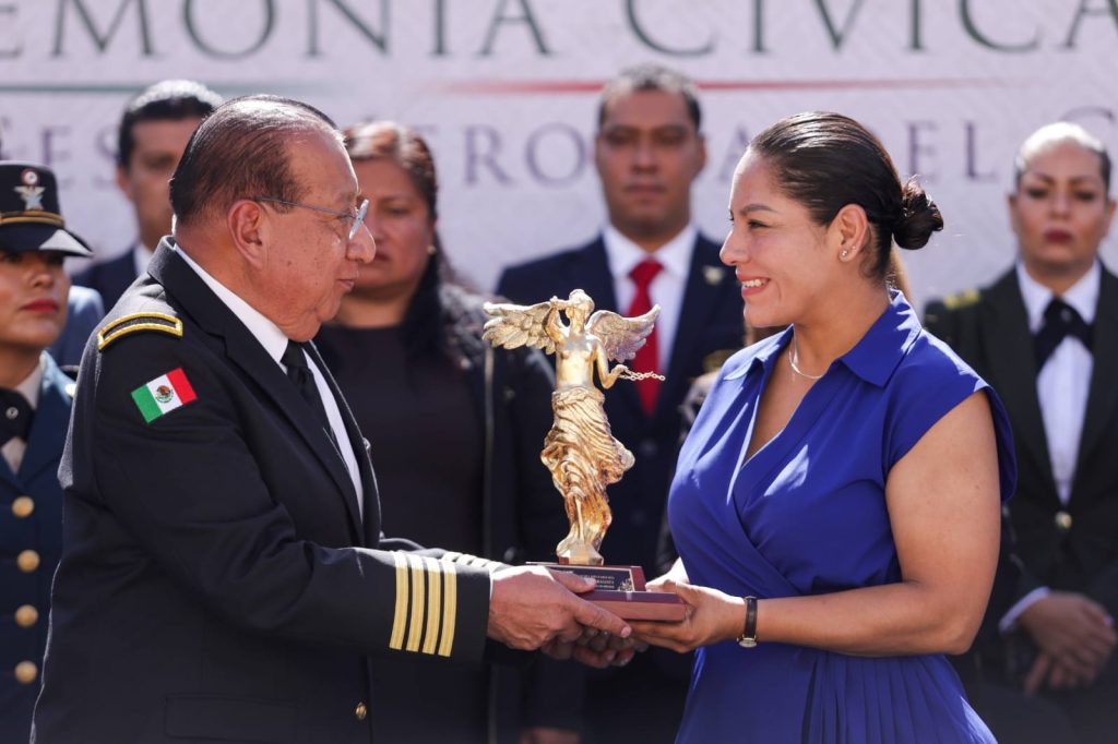 Durante el evento, la presidenta recibió un especial reconocimiento de manos de Daniel Guzmán López, quien, en representación de la Escuela Militarizada, le entregó una presea que simboliza un homenaje a su constancia, virtud y compromiso al frente del municipio.
