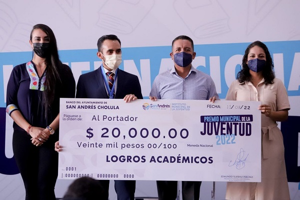 San Andrés Cholula, Puebla.– El presidente municipal, Mundo Tlatehui, en compañía de Sergio Vergara  Berdejo, secretario de Cultura, y José Antonio García Ojeda, director del Instituto Poblano de la Juventud,  realizó la entrega del Premio Municipal de la Juventud 2022, en sus cinco categorías participantes.