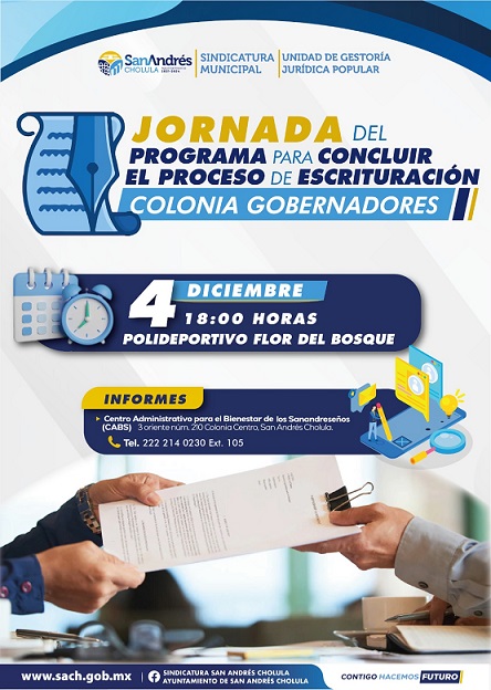 La Sindicatura San Andrés Cholula te invita a la última Jornada del Programa para Concluir el Proceso de Escrituración