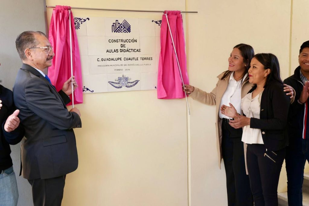 San Andrés Cholula, Puebla.— Como parte de los compromisos cumplidos en el municipio y con el propósito de reforzar las instituciones educativas educación y el bienestar de las niñas, niños y jóvenes del municipio, la presidenta Lupita Cuautle encabezó la entrega dos aulas didácticas en la Escuela Primaria “Justo Sierra”, ubicada en la junta auxiliar de San Antonio Cacalotepec.