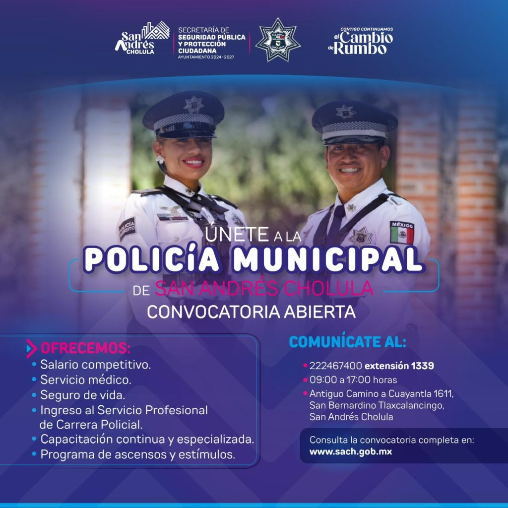 San Andrés Cholula, Puebla.– La Secretaría de Seguridad Pública y Protección Ciudadana (SSPPC) de San Andrés Cholula mantiene abierta la convocatoria para la incorporación de nuevos elementos a la Policía Municipal, con el propósito de fortalecer las tareas de vigilancia, prevención del delito y proximidad social en el municipio.