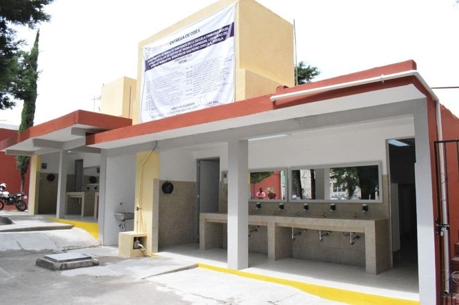 El alcalde detalló que en coordinación, se pudieron conjuntar los módulos sanitarios de las 2 escuelas para ampliar los espacios y así mejorar en su totalidad las instalaciones, lugar donde se instaló azulejo, pintura, mamparas, puertas, cancelería y tarjas; se colocó luminaria tipo led, se suministró y aplicó un sistema impermeable prefabricado, así como construcción de muros cubre tinacos.