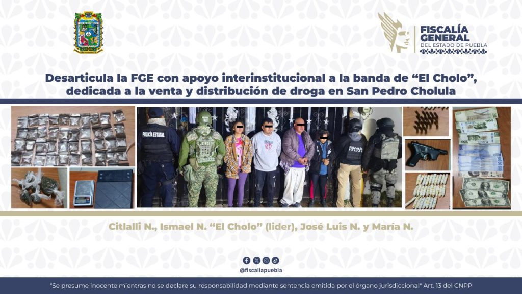 Como resultado de labores de inteligencia y trabajo de campo, la Fiscalía General del Estado (FGE), con apoyo interinstitucional, desarticuló la banda conocida como “El Cholo”, tras la detención de su presunto líder y tres integrantes más, quienes estarían relacionados con la venta y distribución de droga en el municipio de San Pedro Cholula; asimismo, se aseguró droga y un inmueble utilizado como punto de operación.