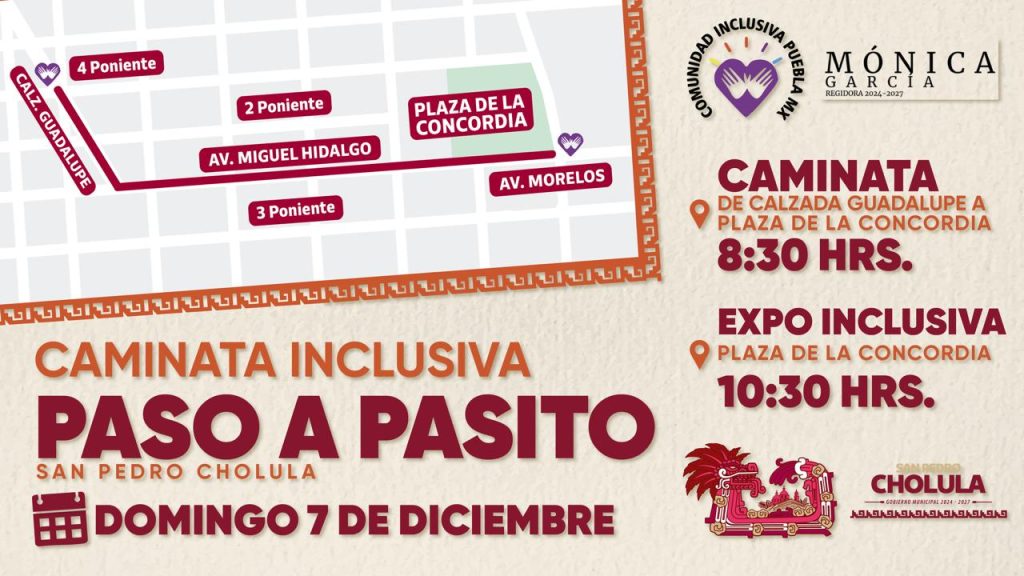 Este 7 de diciembre a las 8:30 a.m., se llevará a cabo la Caminata Inclusiva “Paso a Pasito” y la Expo Inclusiva, actividades organizadas por la Regiduría de Agenda 2030 y Asuntos Metropolitanos en coordinación con la agrupación Comunidad Inclusiva Puebla Mx, con el objetivo de promover el respeto, la participación plena y la igualdad de oportunidades para todas las personas.