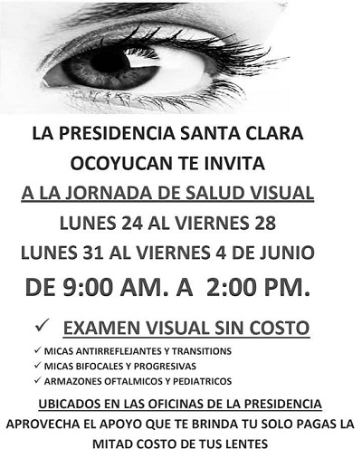 El ayuntamiento de Ocoyucan te invita a la jornada de salud visual que se realiza en la Presidencia Municipal de Santa Clara Ocoyucan.