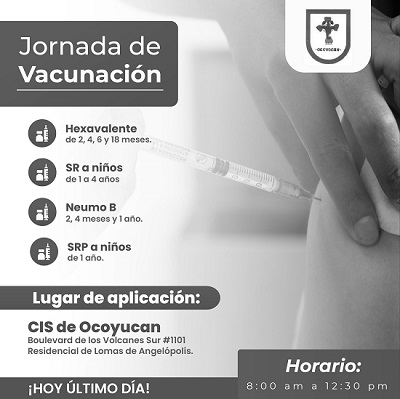 Recuerda que hoy es el ultimo día de la Jornada de Vacunación que se lleva a cabo en el CIS de Ocoyucan, el día de hoy se estarán aplicando más vacunas para beneficio de los niños de nuestro municipio.