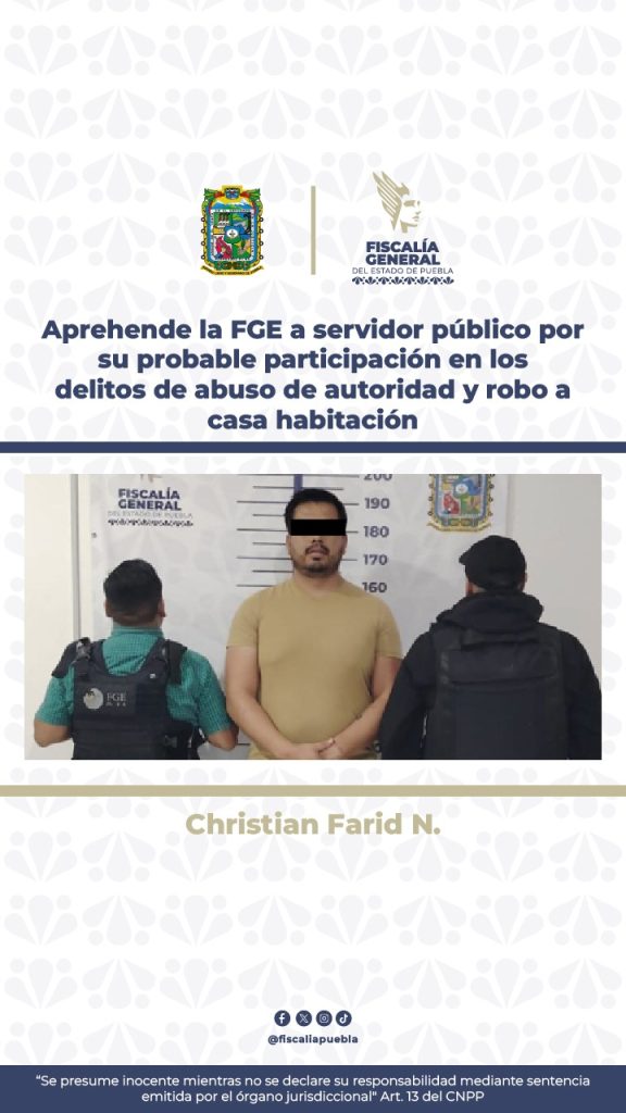 La Fiscalía General del Estado cumplimentó la orden de aprehensión en contra de Christian Farid N., de 33 años de edad, quien se desempeñaba como agente ministerial, por su probable responsabilidad en la comisión de los delitos de abuso de autoridad y robo a casa habitación.