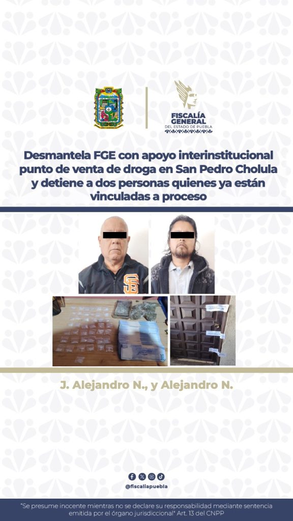 La Fiscalía General del Estado (FGE), en coordinación con la Secretaría de la Defensa Nacional (DEFENSA), desmanteló en el municipio de San Pedro Cholula un inmueble que presuntamente funcionaba como punto de venta y distribución de droga. Durante el cateo, fueron detenidos Alejandro N. y Alejandro N., quienes ya se encuentran vinculados a proceso como probablees responsables de delitos contra la salud en su modalidad de narcomenudeo con fines de suministro.