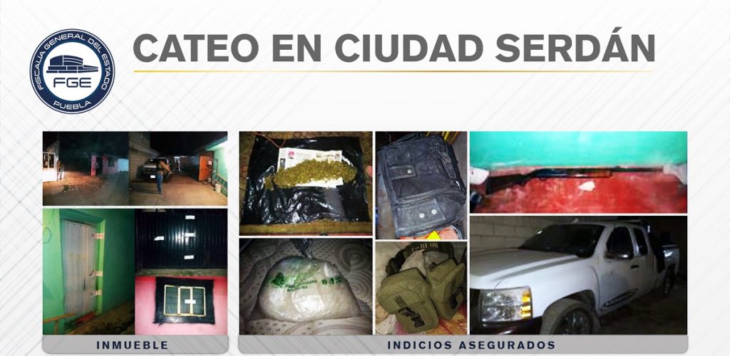 Como parte de investigaciones sobre bandas dedicadas al robo de vehículos, la Fiscalía General del Estado de Puebla cumplió orden de cateo en dos domicilios del municipio de Ciudad Serdán donde aseguró un arma, droga, equipo táctico y un vehículo con placas del estado de Guerrero.